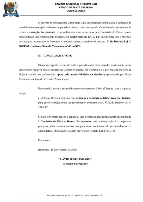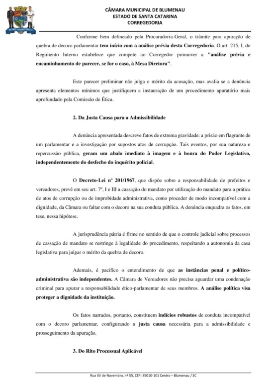 “A denúncia apresentada descreve fatos de extrema gravidade: a prisão em flagrante de um parlamentar e a investigação por supostos atos de corrupção. Tais eventos, por sua natureza e repercussão pública, geram um abalo imediato à imagem e à honra do Poder Legislativo, independentemente do desfecho do inquérito policial”, escreveu em um trecho o corregedor, para em seguida afirmar.