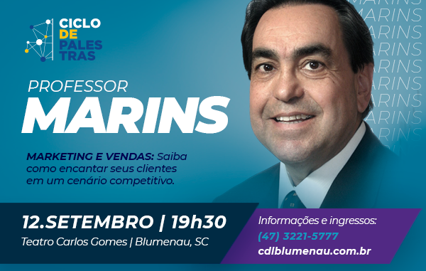 No dia 12 de setembro, o professor Marins estará em Blumenau para realizar a palestra “Marketing e Vendas: saiba como encantar seus clientes em um cenário competitivo”. Será no Teatro Carlos Gomes, às 19h30. A ação faz parte do Ciclo de Palestras, promovido pela CDL Blumenau em parceria com a UniSagres. Os ingressos estão à venda no site www.cdlblumenau.com.br.