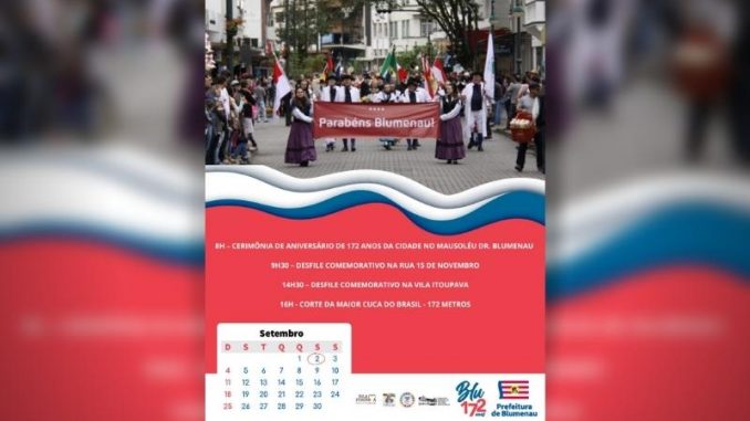 A programação segue até o dia 26 de setembro com caminhada ecológica, shows musicais, cinema folclore, teatro, palestras, lançamento de livro entre outras atrações. “As atividades incluem desde homenagens como ao professor Dario Pgarl, doutor honoris causa da Universidade de Strassbourg, que receberá a Comenda da Cultura, no dia 2, a apresentação de dança, canto, cinema, artes visuais e literatura”, destaca o secretário municipal de Cultura, Rodrigo Ramos. “O desfile de aniversário também fará uma homenagem ao bicentenário de nascimento de Fritz Müller.”