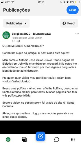Depois que o Informe Blumenau publicou mais uma sentença desfavorável para um perfil anônimo desta eleição, no caso a página Eleição 2020, o responsável me procurou. É Antônio José Vailati Júnior. Ele diz que tem a mesma página em Joinville e Araquari.