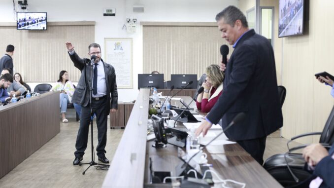Na foto que ilustra este post, tirada em agosto de 2023, o então presidente da Câmara, Almir Vieira, dá posse ao suplente Marchetti.