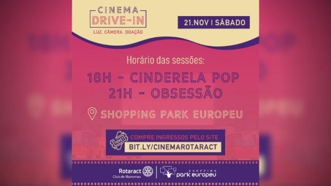 O evento acontecerá no dia 21 de Novembro, no estacionamento do Shopping Park Europeu, e terá duas sessões de filmes, uma as 18 horas com o filme “Cinderela POP” e outras às 21 horas com o filme “Obsessão”. O valor dos ingressos é de R$ 15,00 por carro e mais 3kg de alimento por pessoa e os ingressos podem ser adquiridos através do site bit.ly/cinemarotaract ou pelas nossas redes sociais @rotaractblumenau.