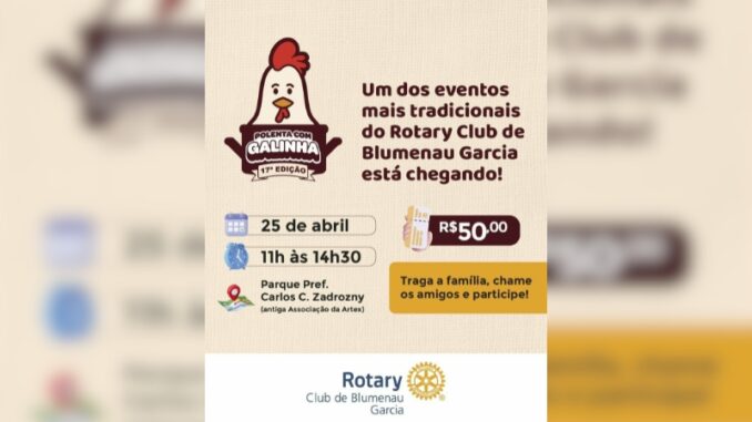 O Rotary Club de Blumenau Garcia anuncia a 17ª edição do tradicional evento beneficente Polenta com Galinha, consolidado como um dos maiores movimentos sociais da região.  A edição de 2026 será realizada na Associação Artex no dia 25 de abril, a partir das 10h da manhã na Associação Artex. Mais do que uma celebração gastronômica, o encontro é responsável por viabilizar projetos que transformam vidas por meio da educação, saúde, inclusão social e apoio comunitário.