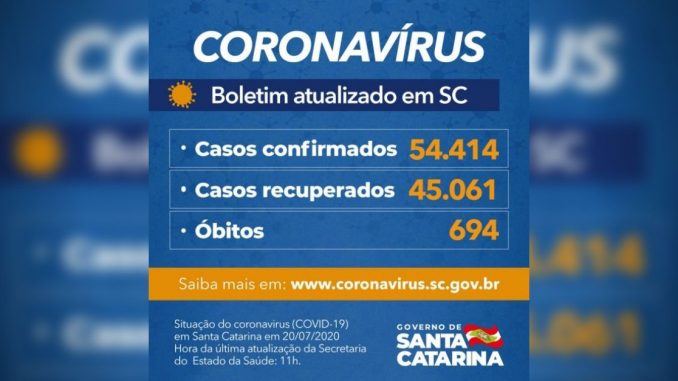 Santa Catarina chegou a 54.414 casos confirmados de Covid-19, sendo que 45.061 estão recuperados e 8.659 continuam em acompanhamento. O número foi divulgado nesta segunda-feira, 20. O novo coronavírus causou 694 óbitos no estado desde o início da pandemia. Com isso, a taxa de letalidade é de 1,28%.