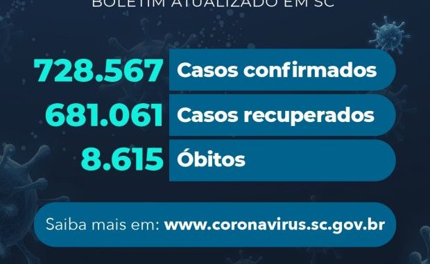 Santa Catarina já registrou 728.567 casos confirmados de Covid-19. Desses, 681.061 são considerados recuperados e 38.891 continuam em acompanhamento. O dado foi divulgado neste sábado, 13. O novo coronavírus causou 8.615 óbitos no estado desde o início da pandemia. Esses números colocam a taxa de letalidade em 1,18%.
