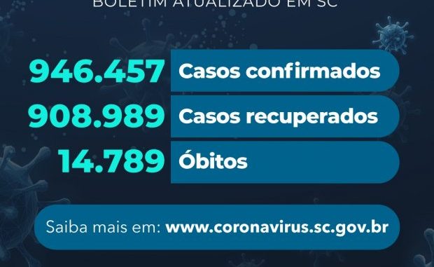 O Governo do Estado relatou que há um total de 946.457 casos confirmados de Covid-19 em Santa Catarina, dos quais 908.989 estão recuperados e 22.679 permanecem em acompanhamento. O dado foi divulgado neste sábado, 22. O novo coronavírus causou 14.789 óbitos no estado até esta data. A taxa de letalidade é de 1,56%.