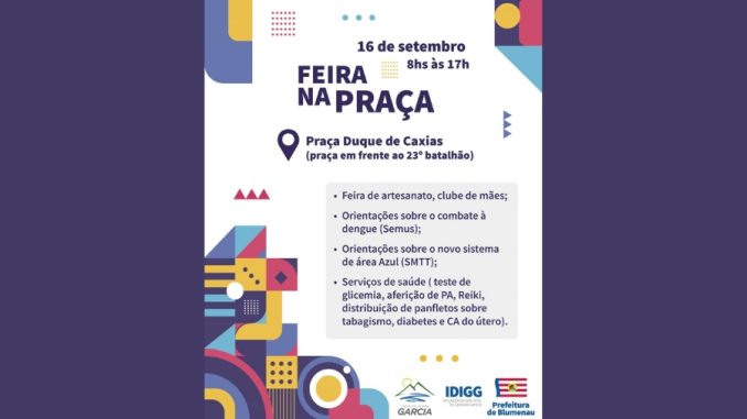 No sábado, dia 16, a Prefeitura de Blumenau promove a Feira na Praça com a participação de diversas secretarias municipais, como a Intendência Distrital do Grande Garcia (IDIGG) que é a organizadora do evento, além das secretarias de saúde e Secretaria de Trânsito e Transportes.