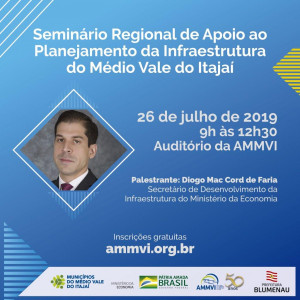 O secretário do Desenvolvimento da Infraestrutura do Ministério da Economia, Diogo Mac Cord de Faria, vai palestrar nesta sexta-feira (26), durante o Seminário Regional de Apoio ao Planejamento da Infraestrutura do Médio Vale do Itajaí. O evento acontece a partir das 9h, no auditório da Associação dos Municípios do Médio Vale do Itajaí (Ammvi), em Blumenau.