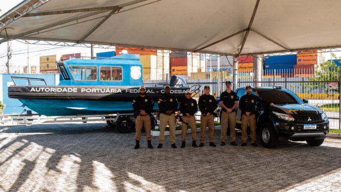 Um dos momentos simbólicos do seminário foi a entrega de novos equipamentos à Guarda Portuária de Itajaí, ação que marca o início prático da parceria com a Autoridade Portuária Federal – CODEBA e reforça a estrutura de segurança do Porto. Foram entregues uma viatura operacional modelo L200, destinada ao patrulhamento terrestre; uma lancha de alumínio, que amplia a capacidade de vigilância e resposta nas áreas aquaviárias; além de coletes, uniformes, pistolas calibre .380 ACP, destinadas ao armamento institucional da Guarda Portuária, garantindo melhores condições de atuação e proteção dos agentes, dentro dos protocolos legais.