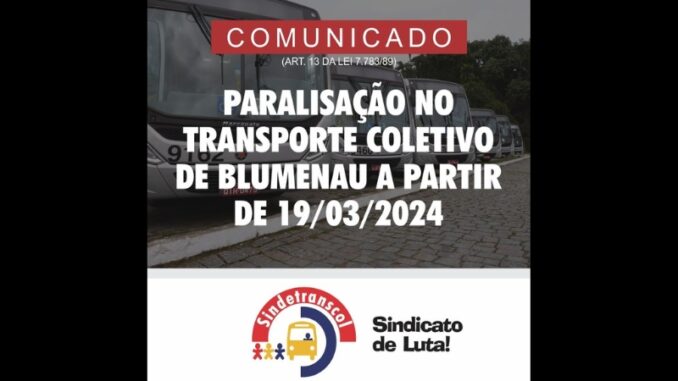O Sindetranscol, sindicato dos Trabalhadores do Transporte Coletivo de Blumenau, anunciou em suas redes sociais que haverá novas paralisações dos ônibus a partir do dia 19. Diz ainda ter comunicado a Prefeitura e a Blumob da paralisação.