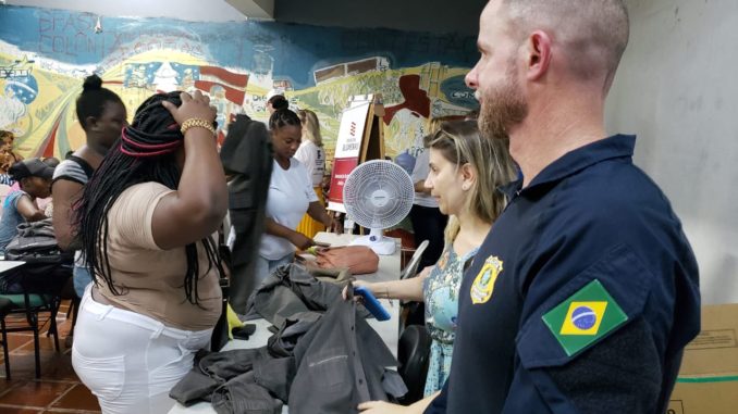 Uma parceria entre Polícia Rodoviária Federal, IFSC, Curso de Moda do SENAI e Pastoral dos Migrantes resultou na entrega de 600 peças de uniformes descaracterizados da PRF.