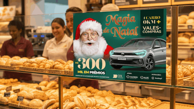 A Magia de Natal 2025 sorteará um carro Virtus Comfortline zero quilômetro e 299 vales-compras nos valores de R$ 300, R$ 500 e R$ 1.000.