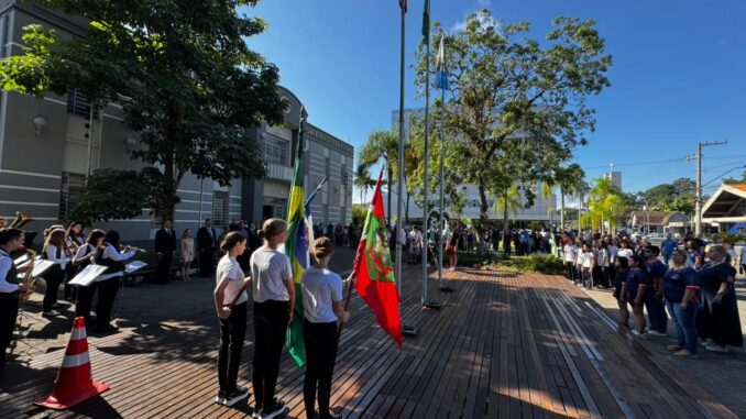 A solenidade também contou com o tradicional hasteamento das bandeiras, execução do Hino Nacional e do Hino de Timbó, reforçando o sentimento de pertencimento e orgulho da comunidade.