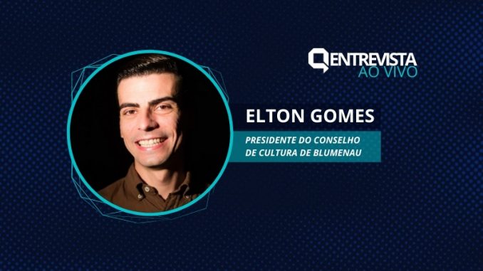 O jornalista Alexandre Gonçalves entrevista o presidente do Conselho de Cultura de Blumenau, Elton Gomes.