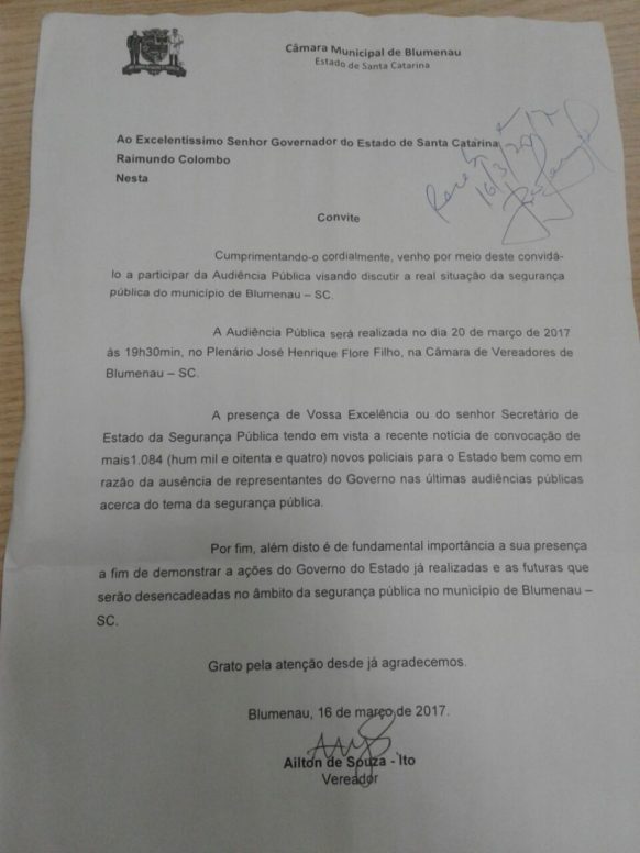 Apenas Ito conversou com o governador, rapidamente. Falou sobre a audiência pública que a Câmara realiza nesta segunda-feira, 20, para debater a Segurança Pública. Fez o convite para Colombo para ele estivesse presente ou enviasse o secretário de Segurança Pública, César Grubba. Pediu para assinar o documento, inclusive.