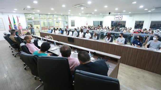 A Câmara de Vereadores de Blumenau realizou na noite desta segunda-feira (21) a sessão de instalação da Legislatura 2022 da Câmara Mirim, com o compromisso e posse dos vereadores mirins eleitos no ano passado pelos seus respectivos educandários e eleição da 1ª Mesa Diretora mirim desta legislatura. A presidência dos trabalhos desta sessão, com compromisso e posse dos vereadores mirins, foi da vice-presidente da Casa, vereadora Silmara Silva Miguel (PSD). No início da solenidade, os vereadores mirins prestaram em conjunto o compromisso de posse e, logo depois, um a um nominalmente, assinaram o Termo de Posse. Logo após, vereadores adultos utilizaram a tribuna, assim como os representantes do Executivo Municipal e da Câmara Mirim.