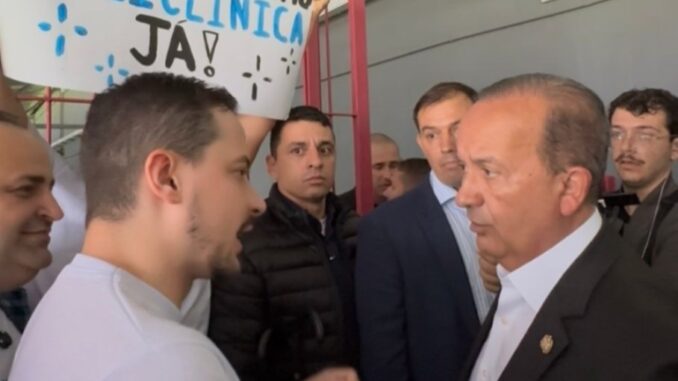O governador Jorginho Mello (PL) passou por uma saia-justa ao subir as arquibancadas do estádio do SESI, onde aconteceria o ato oficial de entrega de todo o complexo para o município. Foi cobrado pelos vereadores petistas Jean Volpato e Adriano Pereira sobre a policlínica regional no Vale do Itajaí.